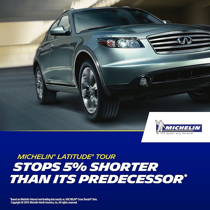 Le pneu Michelin Latitude Tour a une conception à larges rainures et contient de la silice. Ils aident le pneu à s'arrêter 5% plus court que les autres pneus commerciaux, ce qui signifie qu'il est excellent lors de la conduite dans des conditions humides.