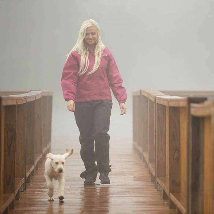 6 Costume Femme Frogg ToggsFrog Toggs a également créé une combinaison de pluie conçue pour les cavalières. Le costume est spécialement conçu pour s'adapter à la forme du corps féminin. C'est un costume deux pièces qui vient avec une veste rose cerise. Il y a aussi une fermeture à glissière pleine longueur sur le devant avec un rabat-tempête qui la recouvre.