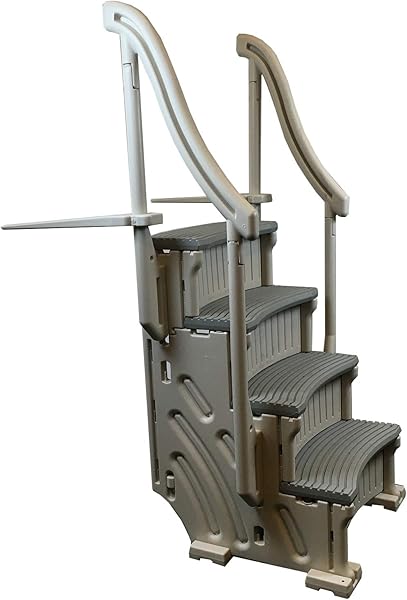 Il s'agit d'une configuration en quatre étapes qui s'adapte aux spas courbes, aux spas ou aux piscines, et elle dispose de deux mains courantes, ce qui rend l'entrée et la sortie de l'eau très sûres et simples à faire. Les marches ont également des bandes de roulement rainurées, qui vous aident également à entrer et à sortir de l'eau.